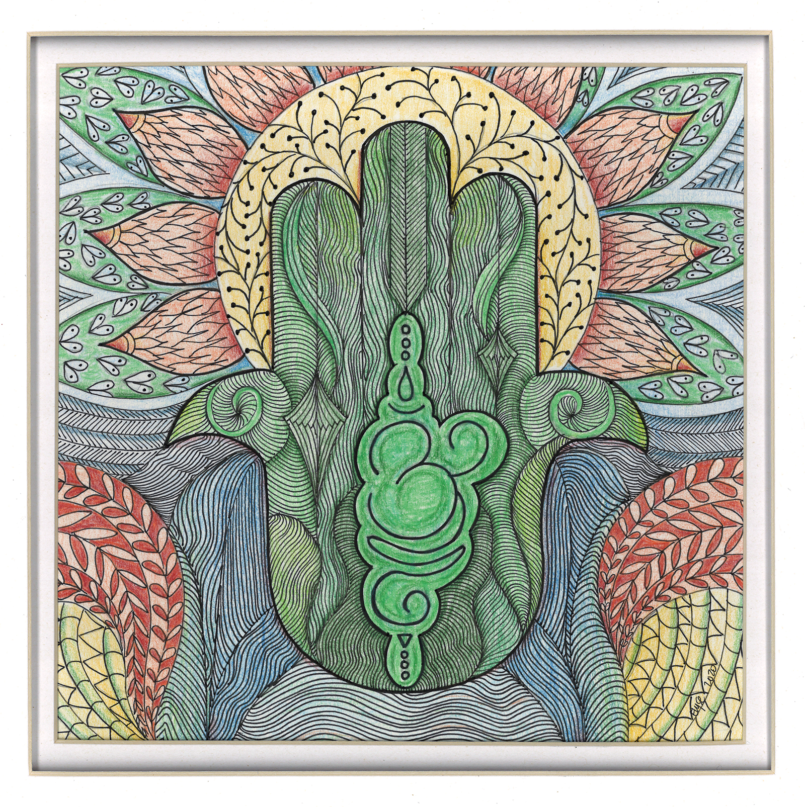 Hamsa in pink and green, 9”x11”, colored pencil on paper